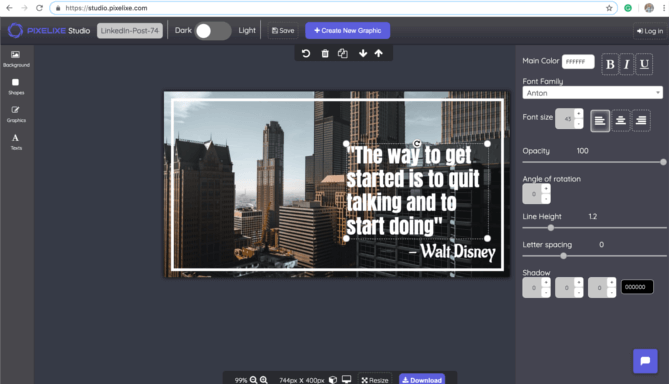 Open Pixelixe Studio and either select a LinkedIn post template from our library or start from scratch clicking on "Create from scratch" to start with the perfect LinkedIn post image dimension. Once in the editor, unleash your inner creative.