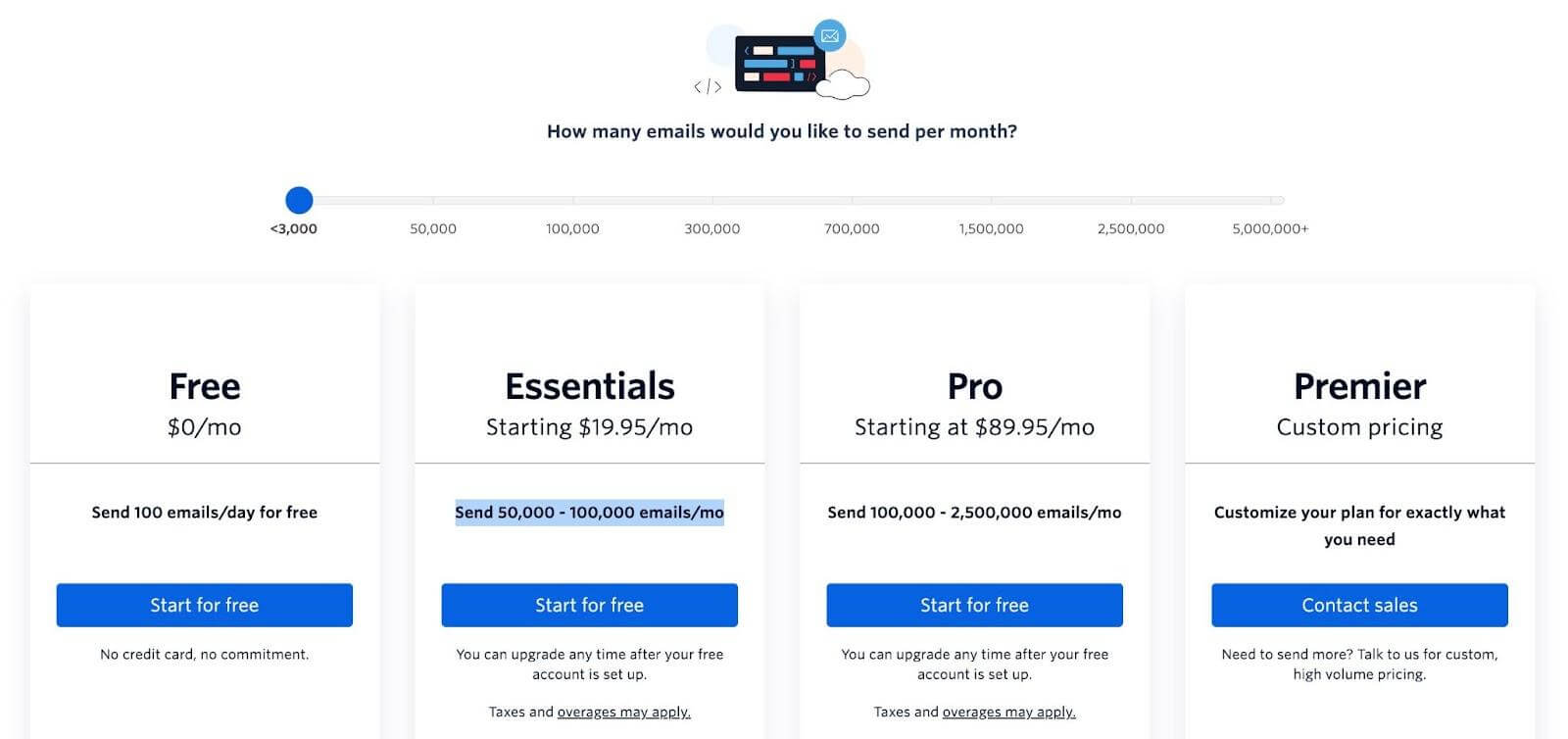 Twilio SendGrid is a good example of a company that uses this hybrid pricing model. Its monthly subscription plans have limits on the number of monthly emails. Once a customer exceeds their limit, usage-based pricing comes into effect.