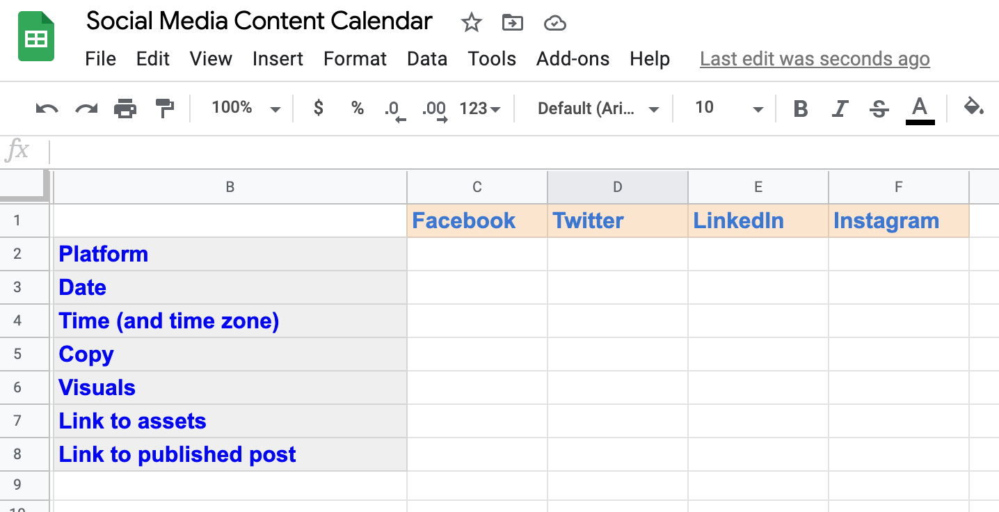 Your social media content calendar is going to be a living document. Graphics designers, marketers, copywriters, and other folks in your team will be visiting it and making updates.