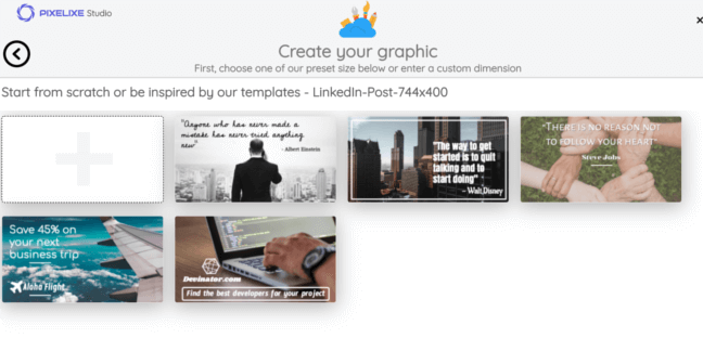 Open Pixelixe Studio and either select a LinkedIn post template from our library or start from scratch clicking on "Create from scratch" to start with the perfect LinkedIn post image dimension. Once in the editor, unleash your inner creative.