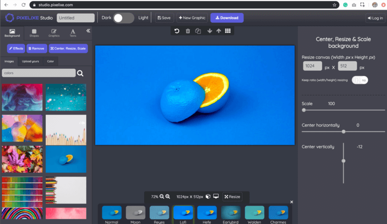 To apply a filter to your background image in Pixelixe Studio, you just have to add a background and the toolbar below with a variety of predefined filters will popup in the bottom of the screen.
