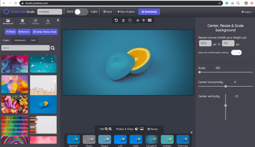 Start by uploading your image into our image editor. Also, our editor comes built-in with more than 3.000.000+ stock photos from professional photographers, in case you lack of inspiration.